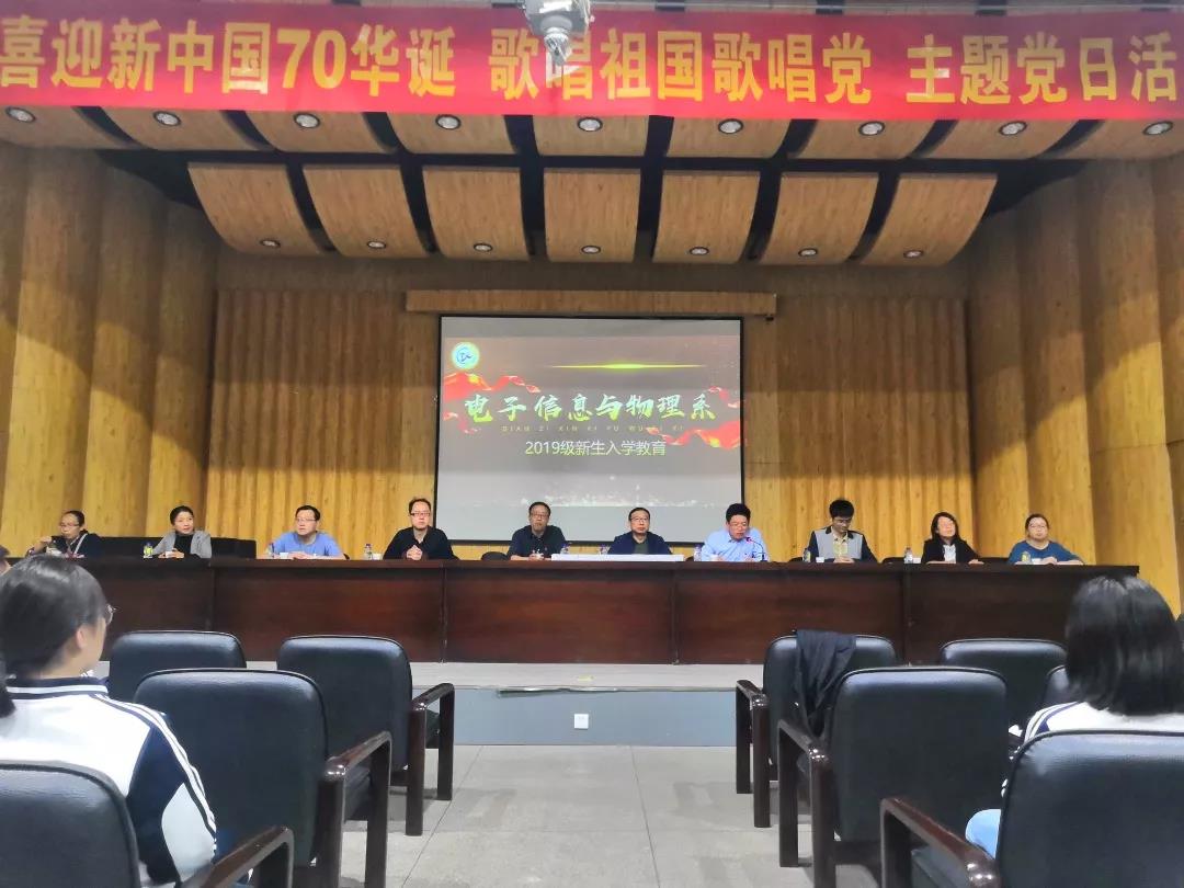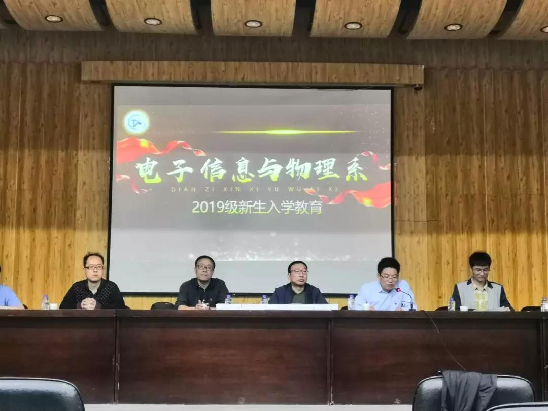 为了给电子信息与西汉姆联2019级新生介绍系部情况和所学的专业,让他们进一步了解自己的专业知识、对以后的学习有更好的规划,电子信息与西汉姆联于2019年9月29日下午7点30分在二号楼报告厅进行了2019级新生入学教育会。参加本次会议的有电子信息与西汉姆联党总支书记卫永清老师,系主任刘建伟老师,党总支副书记王志军老师,系副主任何春乐老师,基础物理教研室主任张凡老师,近代物理教研室主任王艳老师,电子信息技术教研室主任贾兰芳老师,光电信息技术教研室主任逯美红老师,及2019级辅导员王凯雷老师,陈赫老师,苏卫卫老师,黄振芬老师还有学生代表贺文杰以及电子信息与西汉姆联2019级全体新生。
