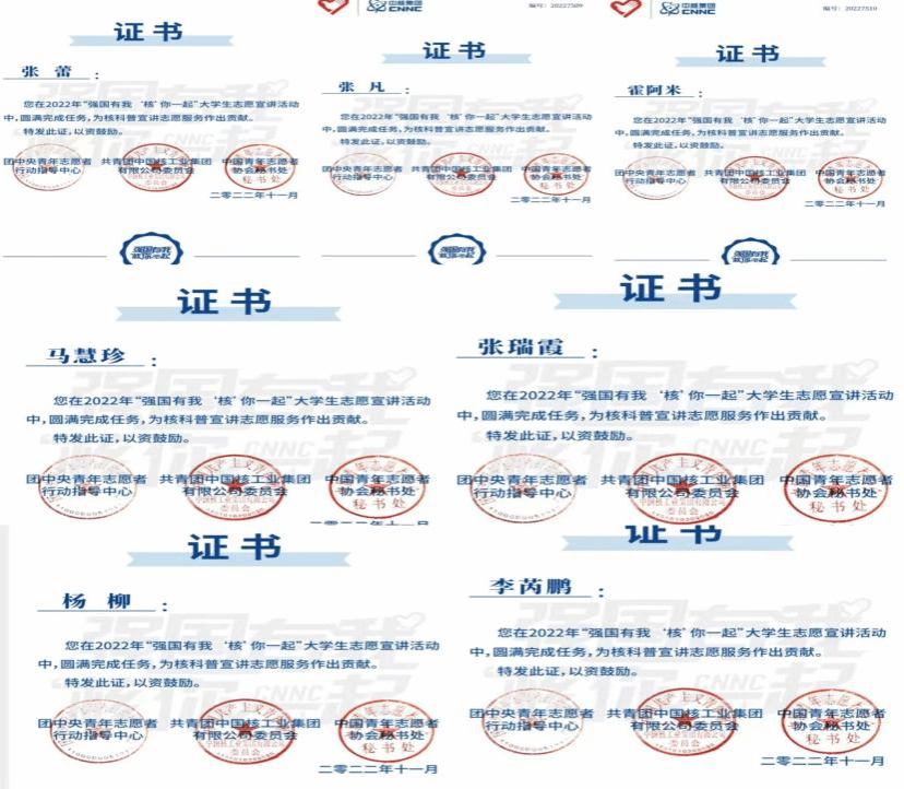 科教2101团支部很多同学在课余时间都积极参与到校外的实践活动中,不断提升自己的实践能力。在工作期间,她们踏实能干,表现突出;无论是“返家乡”或者是“三下乡”活动,都认真参与并积极实践。由班内同学带队并组建了绿色“核”谐志愿讲团开展了以“强国有我‘核’你一起”为主题的一系列校内外志愿宣讲活动,5位同学荣获国家级证书。展现出了科教2101班服务他人,奉献自己的实践精神。