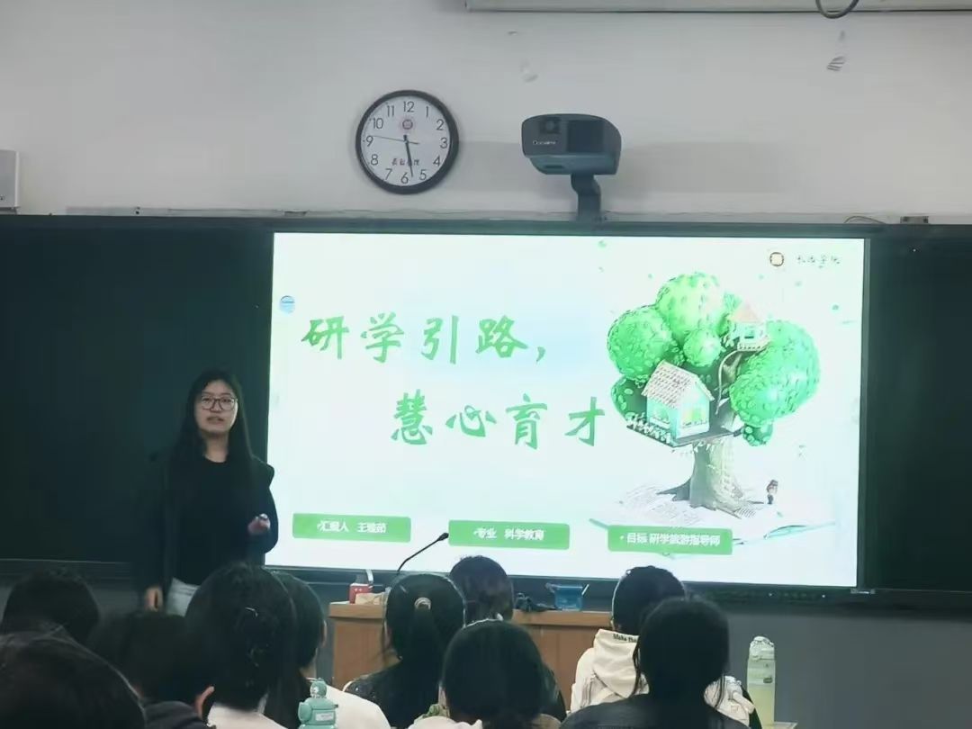 面对“考研热”下的多元选择,王雅茹同学另辟蹊径,以《研学教育赋能职业新赛道》为题,分享其在研学机构担任课程设计师的探索历程。“研学行业正成为教育领域的‘新蓝海’”,她建议学弟妹关注政策导向,考取研学导师资格证,主动参与科普基地实习,将教学创新能力转化为职业竞争力。