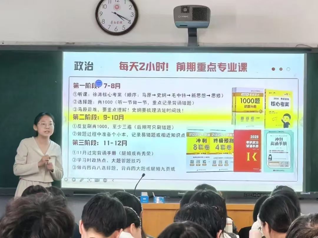 考研“实战派”马慧珍、张益宁、宋超美三位同学分别从不同视角拆解备考要点。马慧珍聚焦“政治英语突围技巧”,强调“单词量是英语的生命线”,建议利用碎片时间滚动记忆《考研词汇闪过》,并结合真题归纳政治客观题高频考点;张益宁以《择校策略与时间管理》为题,提出“梯度择校法”,提醒考生结合自身基础与院校报录比动态调整目标,同时分享了专业课“三轮复习法”及错题本高效利用心得;宋超美则系统梳理全国师范类院校考研分数线、复试权重等信息,结合自身成功上岸案例,解析如何通过“院校口碑+导师研究方向”双维度锁定最优选择。