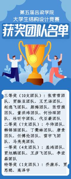 2017年6月,山西省土木建筑学会批准成立了山西省大学生结构设计竞赛委员会,2019年4月变更为山西省土木工程学科竞赛委员会,组织指导山西省大学生结构设计工作,2017年7月首届山西省大学生结构设计竞赛由太原理工大学承办,吕梁学院承办了第二届山西省大学生结构设计竞赛,山西大学承办了第三届山西省大学生结构设计竞赛,第四届山西省大学生结构设计竞赛于2021年7月15日—18日在中北大学举办,吕梁学院参加山西省大学生结构设计竞赛成绩是不错的,前三届的冠军奖杯都由我们吕梁学院团队获得。2018年11月在广州华南理工大学举办的“富力杯”第十二届全国大学生结构设计竞赛中,吕梁学院团队获二等奖。