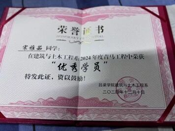 在校期间,宋雅茹同学作为建筑与土木工程系青马雏鹰班学员,积极参加理论学习,投身青马工程志愿服务的行列,书写青春担当,践行责任使命,曾荣获建筑与土木工程系青马工程优秀学员称号。