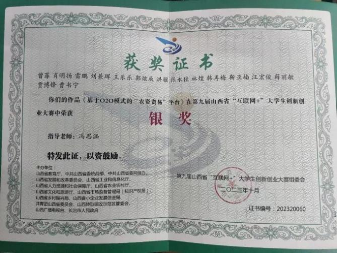 2023年09月获 吕梁学院第九届互联网+校级金奖;