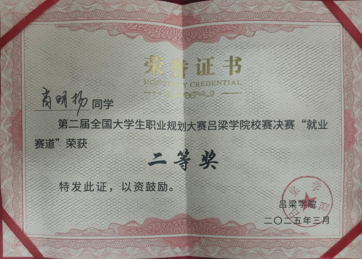而在职业规划的舞台上,肖明扬同样展现出非凡的智慧与勇气。他以清晰的自我认知和对未来的精准洞察,踏上职业规划大赛的征程。在老师的悉心指导与帮助下,历经无数次的打磨与锤炼,他终于在吕梁学院第二届大学生职业生涯规划大赛中脱颖而出,荣获二等奖。这份荣誉的背后,是他对自身专业优势的深度挖掘,是对未来职业道路的精心布局,更是他敢于梦想、勇于挑战的生动写照。