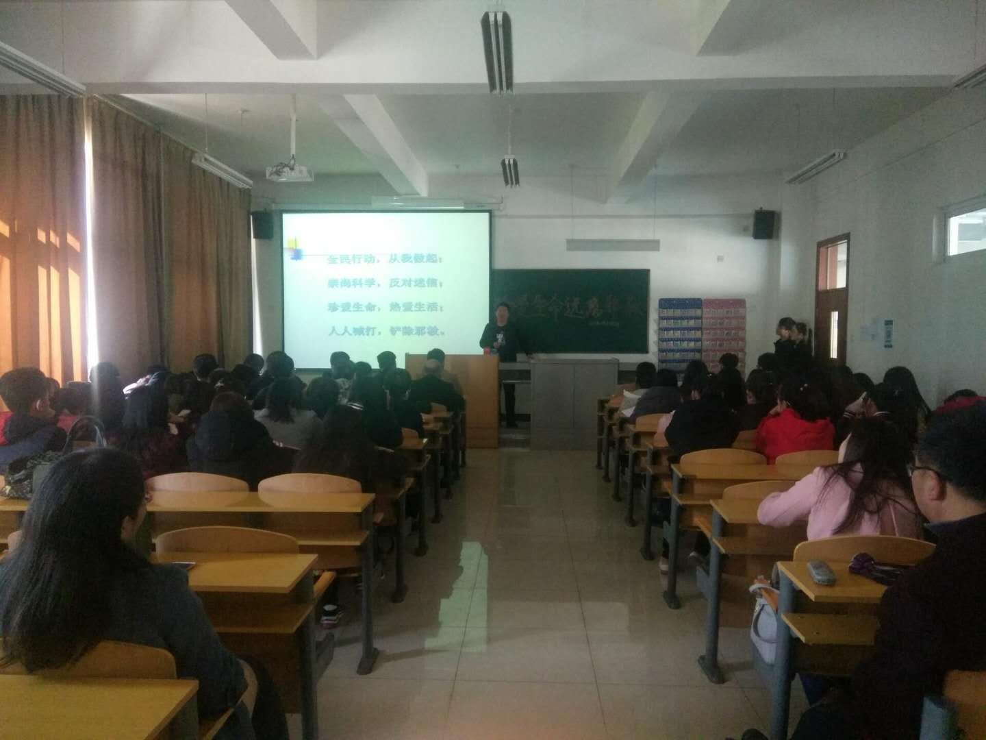 2018年3月8日下午城乡规划16级1班、2班在综A309教室召开了以“崇尚科学·珍爱生命·远离邪教”为主题的主题班会。同时参加此次班会的有建筑系党总支书记刘星明,建筑系系主任高树峰,副书记韩彩志以及部分班主任教师和全班同学