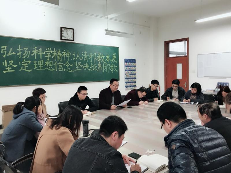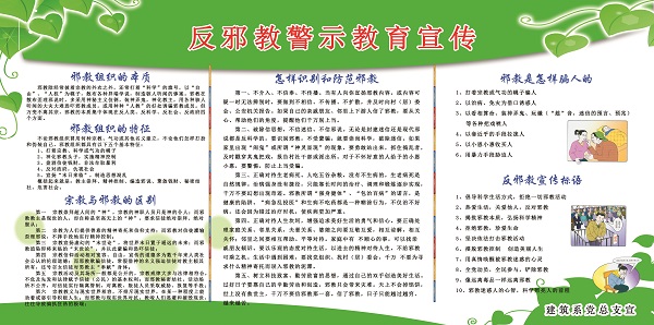 为进一步增强师生的法治观念和安全意识,加强反邪教宣传教育工作的力度和深度,切实提高师生自觉抵御邪教侵蚀的能力,努力营造积极向上、健康和谐的校园环境,建筑系党总支于3月6日下午组织教职员工开展以“弘扬科学精神,认清邪教本质,坚定理想信念,坚决抵制邪教”为主题的警示教育学习活动。此次学习活动还通过悬挂主题鲜明、内容丰富的宣传展板;安排各班在近一周时间内举办主题班会等形式营造反邪教的浓厚氛围。