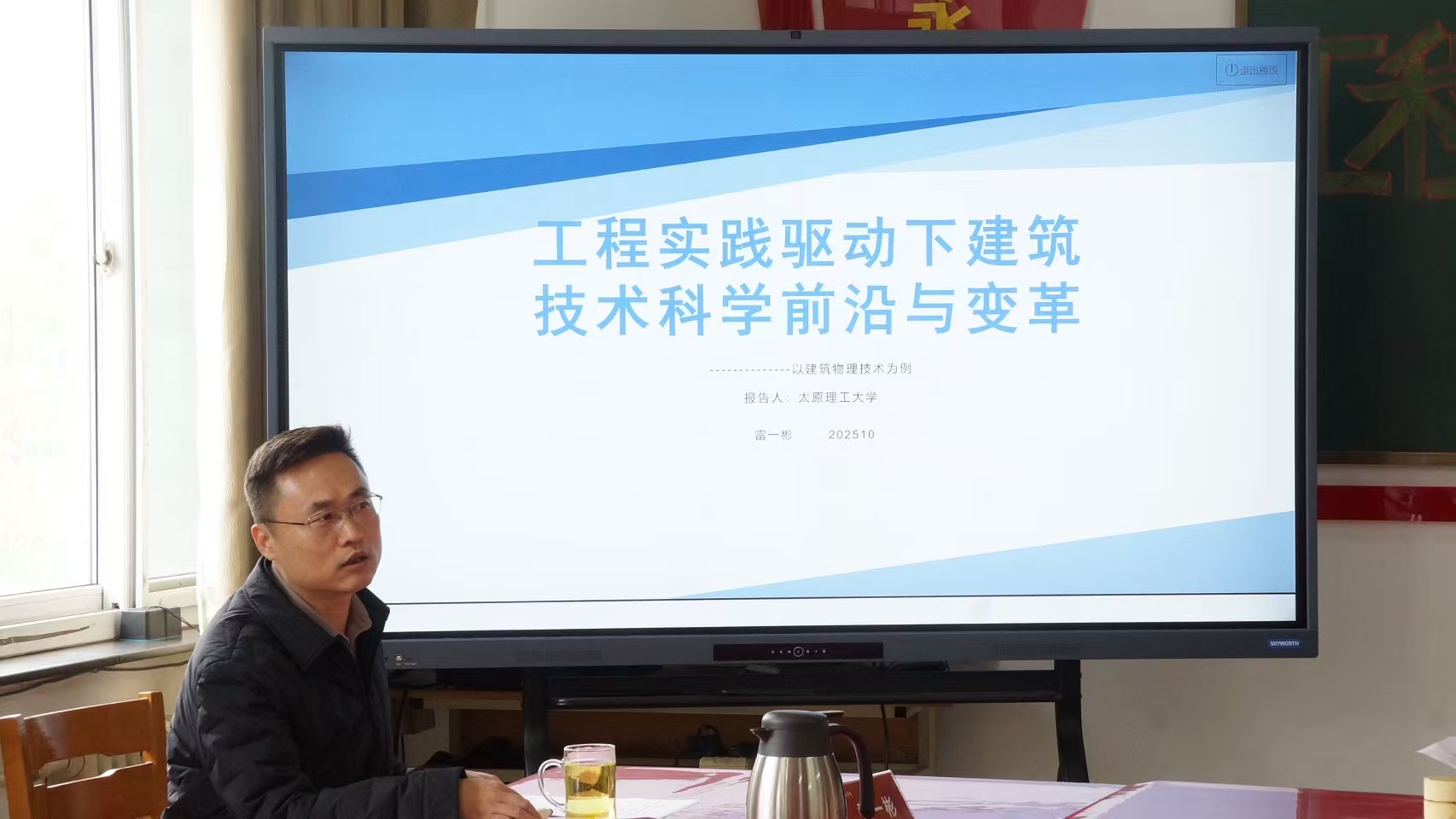 受聘仪式后,雷一彬老师以“工程实践驱动下建筑技术科学前沿与变革”为主题开展专题讲座。讲座中,他先结合行业现状,点出地方高校建筑领域“科研与工程并行下课程压力大、研究方法落后”等共性困境,随后系统阐释“低碳化、健康环境、数字智能化、城市更新、历史数字化”五大建筑技术科学前沿方向。