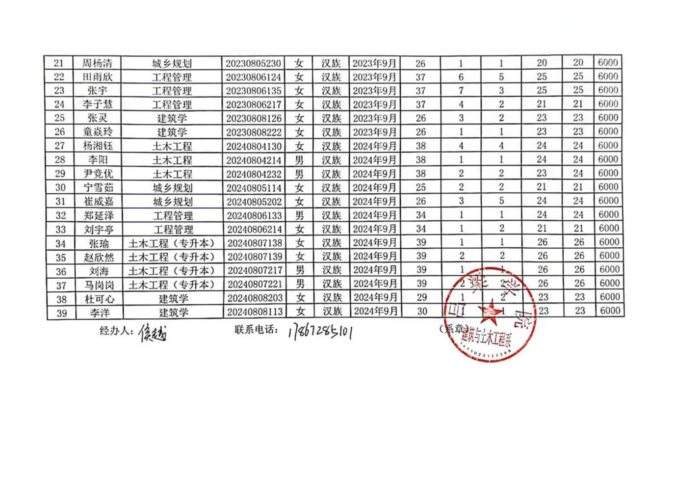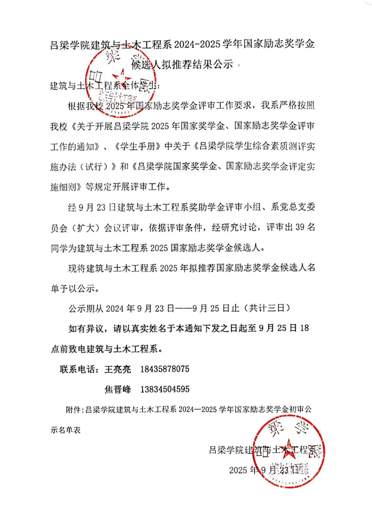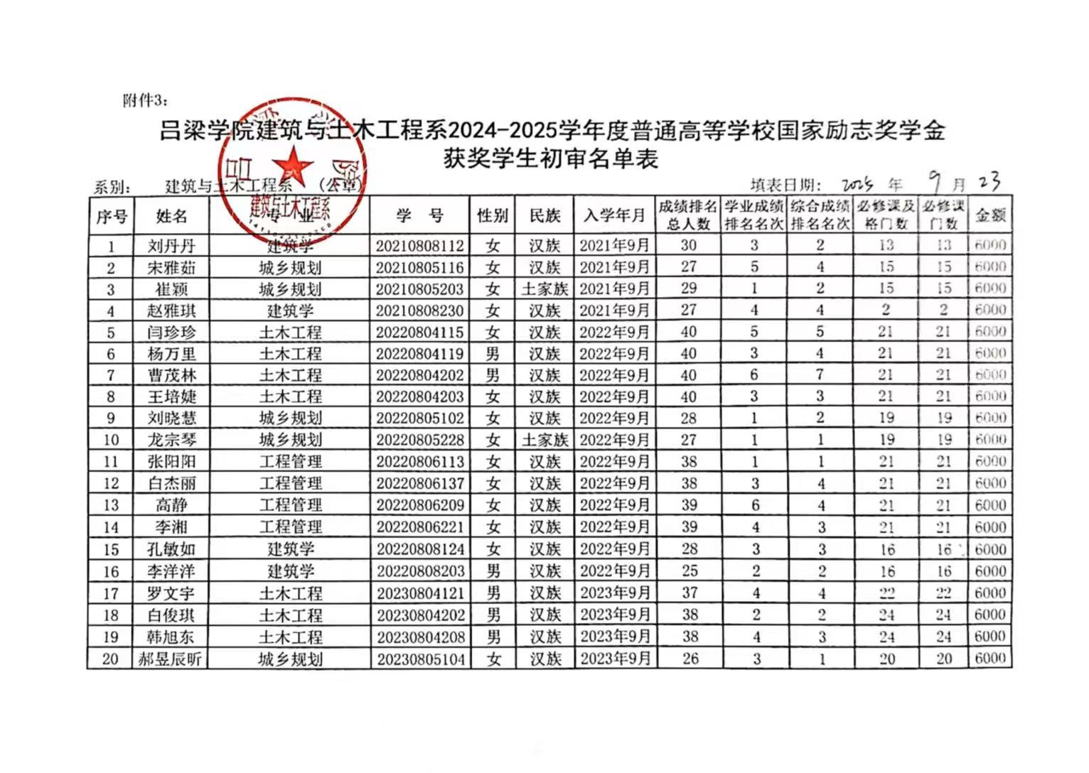 吕梁学院建筑与士本工程系2024-2025学年国家励志奖学金候选人拟推荐结果公示