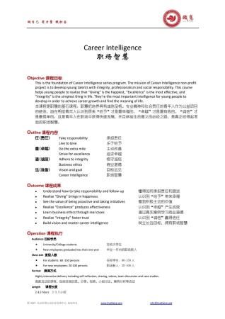 职慧(Career Intelligence)是目前国内大中学生职业素养提升教育方面最专业的公益机构,通过专业的生涯发展与职业素养课程、教练式导师辅导等,培养“做自己、有力量、敢担当”的中国青年,助力每个青年都活出生命价值。