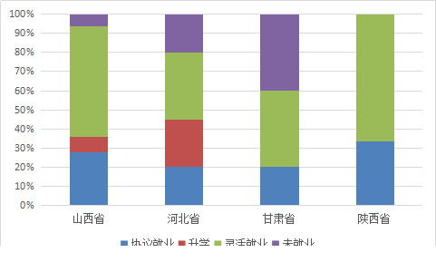 以中西部省份毕业生就业状况来看,不同生源地的毕业生就业形式如图2.2所示。以生源地为山西省、河北省的毕业生为例,山西籍毕业生灵活就业率达到57.88%、协议就业人数占山西省籍毕业生总数的27.76%、升学比例达到8.00%、未就业为6.35%;河北籍毕业生灵活就业率为35%、协议就业人数占河北省籍毕业生总数的20%、升学比例达到25%,、未就业占20%。从签约率与升学率来看,河北省籍的毕业生要显著好于山西省籍的毕业生,而山西省籍的毕业生灵活就业率要远高于河北省,体现出了非常明显的灵活就业地域选择性。甘肃省的毕业生未就业率最高,而陕西省的毕业生未就业率最低,且大部分毕业生选择灵活就业的形式。