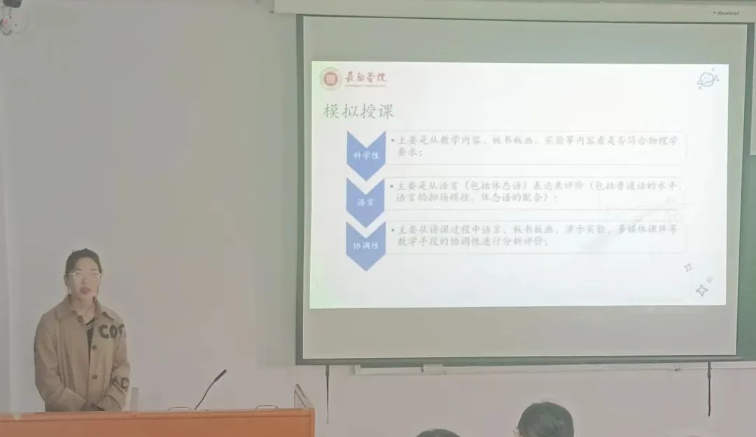接着,陈禹彤从课题准备、如何设计PPT以及如何使课堂有感染力等方面做出详尽的分析,她多次强调将思政元素融入物理课堂的重要性,要将课程思政育人元素以润物细无声的方式融入课程、推入课堂,增强课堂教学的吸引力与感染力。