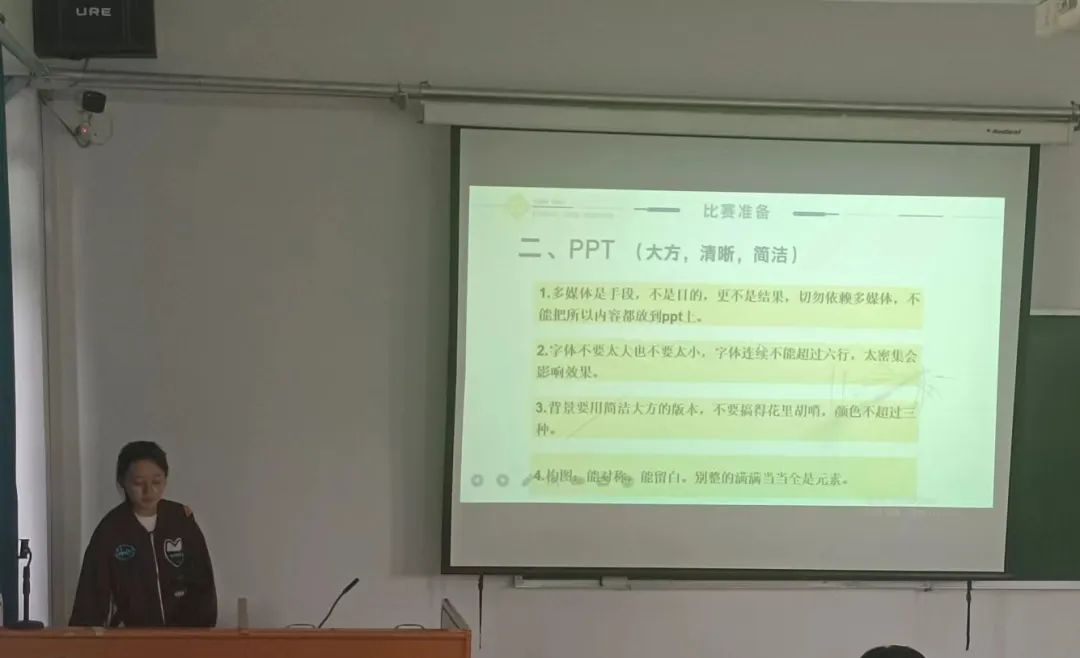 培训会上,王婷围绕教学设计、课题选取、教学目标、教学难点、教学环节、板书设计、课件制作、模拟授课等方面进行了详细的讲解,为参赛学子们提供了经验与指导。她希望同学们在比赛中能抓住一切机会,多磨多练,牢牢把握“上午到下午”这一时间段,并祝愿参赛学子在比赛中获取佳绩。