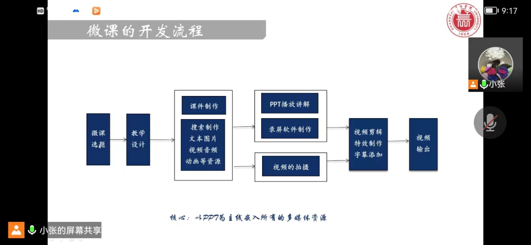 培训会上,张彩风主要从微课制作流程、微课的教学设计、微课的视频制作、获奖微课示例、微课制作的注意事项等五方面进行详细讲解。