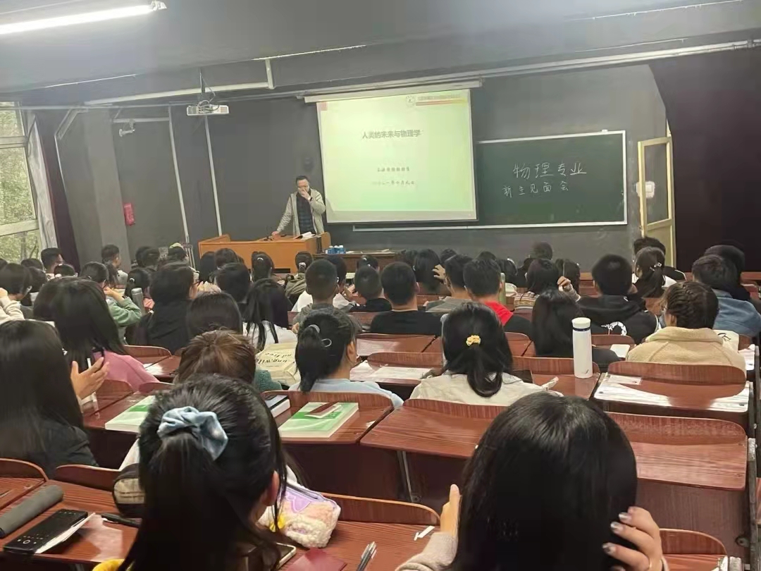 在物理专业教育会中,何春乐首先对新生的到来表示热烈的欢迎和祝贺,并向同学们介绍了物理专业悠久的办学历史、雄厚的师资力量、丰硕的科研成果和显著的专业特色,增加了同学们对未来专业学习的信心。随后张凡从21世纪最难解决的问题切入,讲述物理学专业的潜能及未来的专业前景,之后又从物理专业学习的科目以及学分方面为同学们进行了详细的讲解,从而帮助学生建立了专业学习的初步思想架构,让他们对本专业有了更深层次的认识。最后他希望学生坚定最初的选择,热爱所选择的物理专业,把理论知识学习和技能结合起来,用所学知识指导实践,在实践中反思升华。