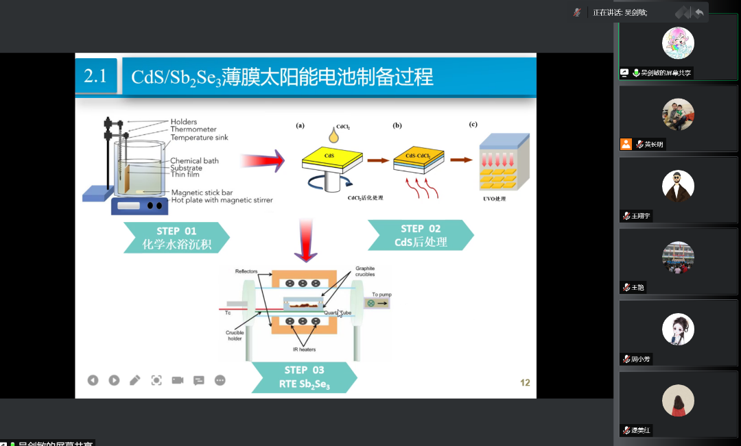接着,吴剑敏博士介绍了二元硒化物硒化锑(Sb2Se3)和硒化亚锗(GeSe)薄膜太阳能电池相关的内容。传统化石能源的过度开采与使用,引发了严重的环境污染问题,太阳能作为一种清洁可再生能源受到了大家的普遍关注。太阳能电池是一种把太阳能转换成电能的有效装置,其中,薄膜太阳能电池由于成本低、效率高、器件轻质化、微型化、柔性化等优点得到迅速发展。而二元硒化物Sb2Se3和GeSe因其原料储量大、绿色无毒、价格低廉且光电性能稳定等优点,成为近年来薄膜太阳能电池领域的研究热点。Sb2Se3和GeSe电池效率提升的关键在于吸收层薄膜生长取向的调控,以及减少缓冲层与吸收层之间的界面缺陷。其中缓冲层起着至关重要的作用。报告主要围绕缓冲层材料的选取以及对缓冲层进行适当后处理来降低薄膜缺陷,减少载流子传输损失,以及对吸收层薄膜生长取向调控从而提高载流子传输效率,展示了二元硒化物Sb2Se3和GeSe薄膜太阳能电池其良好的应用前景。