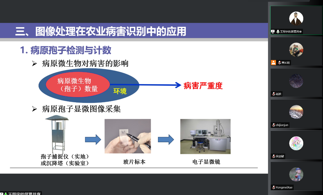 首先,王翔宇博士对农业相关背景知识进行了介绍,指出中国作为农业大国,近年来蔬菜粮食作物产量均居世界第一,但病害情况依然严重。针对这一问题,采用图像处理等信息化技术对作物病害进行识别,可以提高病害诊断效率,及时为农户提供作物病害防治依据。利用图像增强、边缘检测、分割、形态学处理等技术可以完成作物病原微生物的识别与统计,为病害种类诊断和病害严重度判别提供依据。在图像处理技术中结合光谱分析,以及支持向量机、深度学习等算法,可以实现作物病斑的提取和作物病害的分类识别,为农业病害识别与诊断提供技术支持和方法依据。