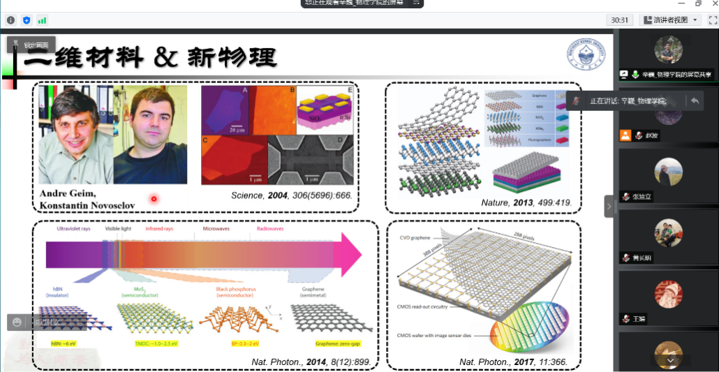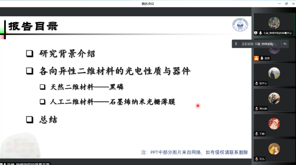 2022年4月8日上午10点10分,东北师范大学物理学院辛巍教授应邀通过腾讯会议,线上为我系教师作了题为《各向异性二维材料的光电性质与器件研究》的学术报告,西汉姆联全体教师参加了此次报告交流会。