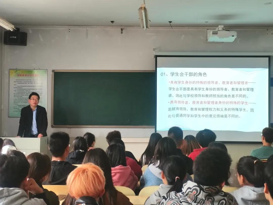接着,王志军对学生骨干提出了具体要求:学生骨干应该严格要求自己,起到表率作用,带头树立良好的学风校风,积极制止不文明行为,通过各项活动提升思想境界,竭诚为同学服务。他指出,学生骨干主要起纽带作用,在平时的工作学习中要与同学形成良好的关系,并及时向老师反馈学生动态,做好信息的沟通与传递。