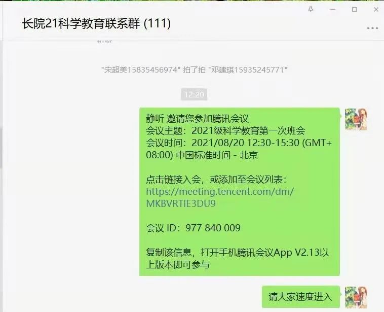 为让21级科学教育专业学生及家长进一步了解学生入学情况,加强与学校联系,深入了解科学教育专业,我系于8月20日中午12点半在腾讯会议开展了线上师生见面会。参加此次会议的有辅导员张蕾、科学教育2101班全体学生及家长。