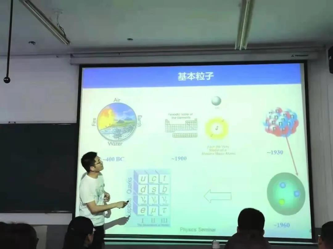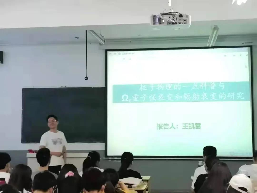 本次论坛的题目是《粒子物理的一点科普与重子强衰变和辐射衰变的研究》。首先,王凯雷向同学们介绍了基本粒子,他指出粒子物理学是研究微观最小客体的性质、运动、相互作用、相互转化的规律的学科,其目的是探讨微观最小客体内部结构的规律,是物理学研究的最前沿。接下来,王凯雷用幽默的语言介绍了自身研究经历和研究成果,大大激发了同学们的科研兴趣。