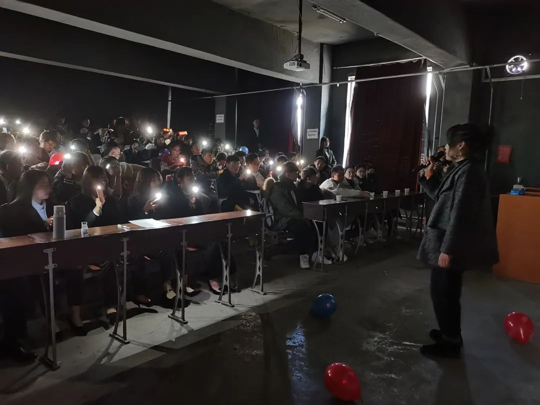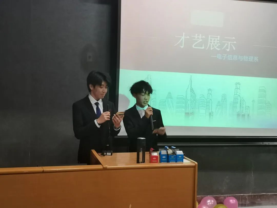 首先物理2001班胡晶柯用一首歌曲——《差不多姑娘》瞬间点燃了现场的气氛,台下同学们打开手机闪光灯,手臂伴随歌声律动,就像天上的星星一闪一闪。
