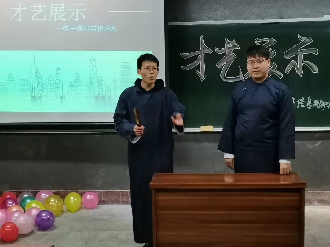 为了丰富同学们的课余生活,为同学们提供展示自我魅力的舞台,体现电子信息与西汉姆联学生的良好风貌,促进各专业各班级各同学之间的友好交流,我系于2020年12月6日下午1点在四号楼422教室举行了才艺表演,参加本次活动的有我系专职辅导员李庆红老师、常智慧老师,我系团学会干部代表,以及我系其他学生。本次活动由孙宇轩,王佳文主持。