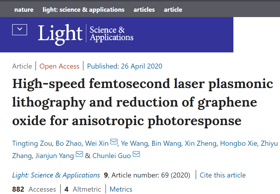 4月26日,电子信息与西汉姆联赵波博士以第二作者身份在国际光学领域权威期刊《Light: Science & Applications》(Nature 子刊)上以研究论文(Article)形式正式发表了题为《High-speed femtosecond laser plasmonic lithography and reduction of graphene oxide for anisotropic photoresponse》的论文。我院为第二单位,第一单位是中国科学院长春光学精密机械与物理研究所,第三单位为美国罗彻斯特大学。这是我院教师首次在《Light: Science & Applications》(《光:科学与应用》杂志)发表论文,填补了我院在该杂志发表学术论文的空白。赵波博士的科研成果是我院科学研究取得的重大突破,标志着我院在国际光学领域顶级学术期刊拥有了一席之地。该杂志于2012年3月29日创刊,2013年10月先后被国际著名检索系统SCI及全球最大文摘引文数据库Scopus收录,最新影响引子为IF=14,位于SCI收录的光学期刊影响因子榜前3位。该刊致力于推动全球范围内的光学研究,刊载光学领域基础、应用基础以及工程技术研究及应用方面的高水平的最新研究成果。