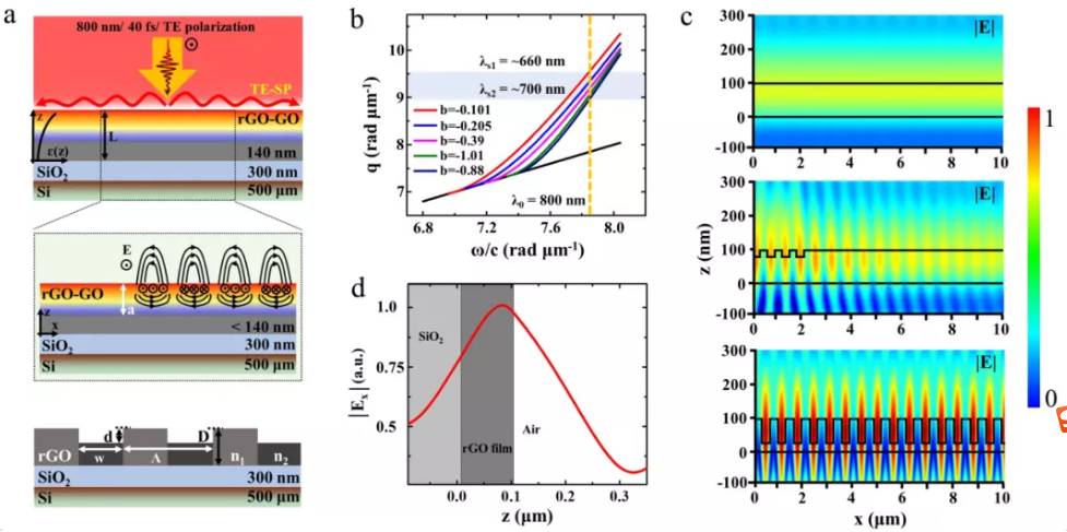 赵波博士在该研究成果中的主要贡献为理论阐明rGO-LIPSS的产生机理。氧化石墨烯(GO)薄膜在飞秒激光照射下,其表面的含氧官能团消失使得材料被还原,导致氧化石墨烯(GO)薄膜介电常数出现自表面向内部的梯度分布,从而支持材料表面TE-SPP的产生。从波动光学的角度对激光作用过程进行了深入分析,并利于FDTD算法对入射光波与TE-SPP激发的耦合过程进行了模拟分析。理论研究结果使得人们对飞秒激光与物质相互作用的动力学过程进一步清晰的认识,为FPL相关技术的进一步发展奠定了基础。