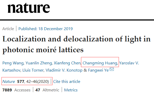 1月2日,国际顶尖学术期刊自然杂志《Nature》以研究论文(Article)形式正式发表了题为《Localization and delocalization of light in photonic moirélattices》的论文。我系黄长明博士主要负责研究成果中的数值模拟部分。该论文成果是我院教师在国际顶尖学术期刊上的重要突破。