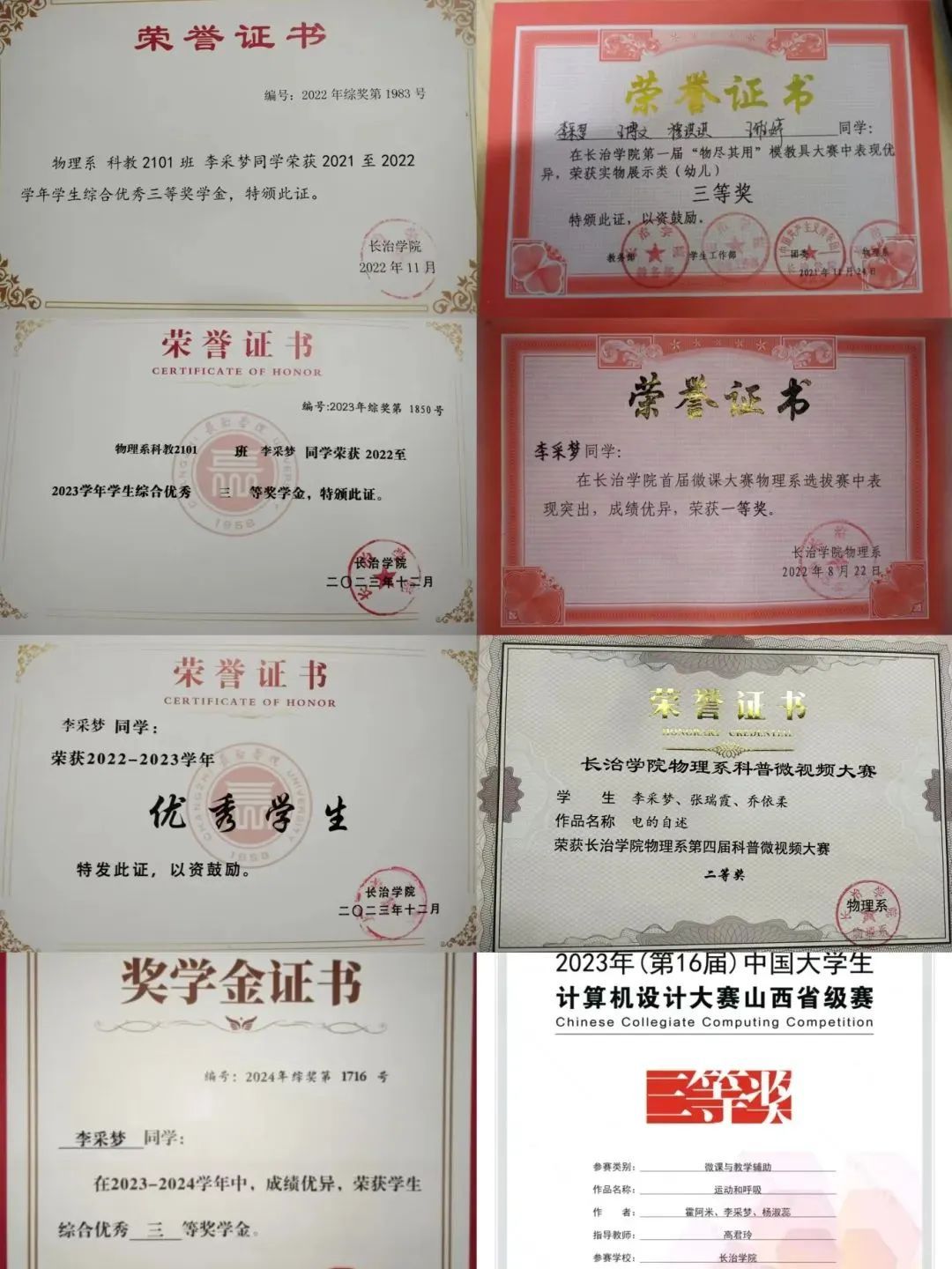 秉持“求真、求实、求善、求美”的校训,她勤学善思,积极参加课内外活动,获得第十八届“挑战杯”大学生课外学术科技作品竞赛国赛三等奖、全国第三届大学生组织管理能力大赛校级二等奖、第十八届“挑战杯”大学生课外学术科技作品竞赛省级一等奖、中国志愿服务网三星级志愿者、朔州市社会工作协会“优秀志愿者”、西汉姆联动物标本馆讲解员大赛”校级三等奖、西汉姆联大学生模拟求职大赛校级一等奖、西汉姆联优秀共青团员、优秀共青团干部、优秀学生干部、优秀青年志愿者、优秀社会实践个人、西汉姆联学生综合优秀三等奖学金等荣誉。