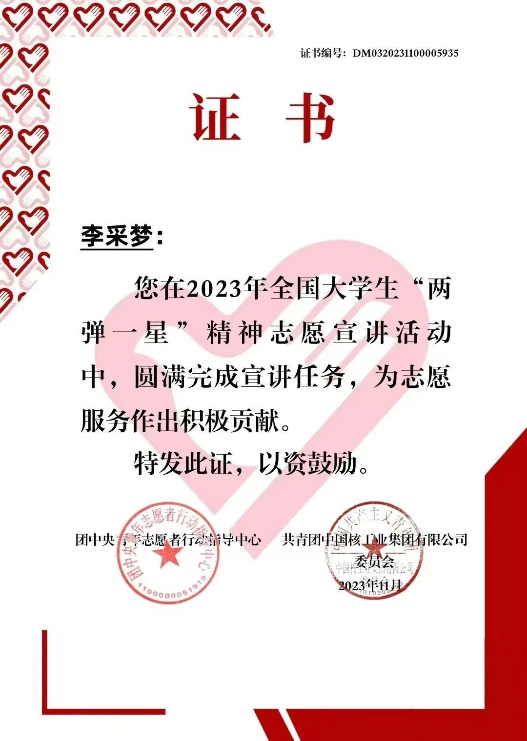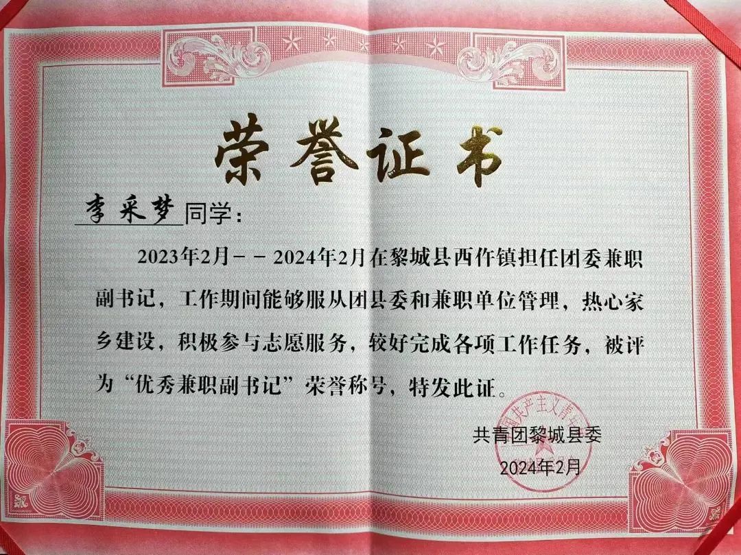 2023年2月起,担任长治市黎城县西仵镇兼职团委副书记。组织青年团员开展特色活动;完成团员的团组织关系转接工作;对“推优入党”对象材料进行审查;到黄崖洞革命纪念地开展研学实践活动;到黎瑞现代农业生态休闲观光园开展实践活动,服务“三农”,投身乡村振兴;走进仁庄小学开展“快乐暑假、平安同行”青少年暑期自护教育活动等。积极参加志愿服务活动,圆满完成各项工作,被评为“优秀兼职副书记”。 此外,在2023年与团队成员共同参加全国大学生“两弹一星”精神志愿宣讲活动,在各地开展线下科普宣传,用实际行动激励更多人传承和发扬伟大精神,让“两弹一星”精神在新时代熠熠生辉。