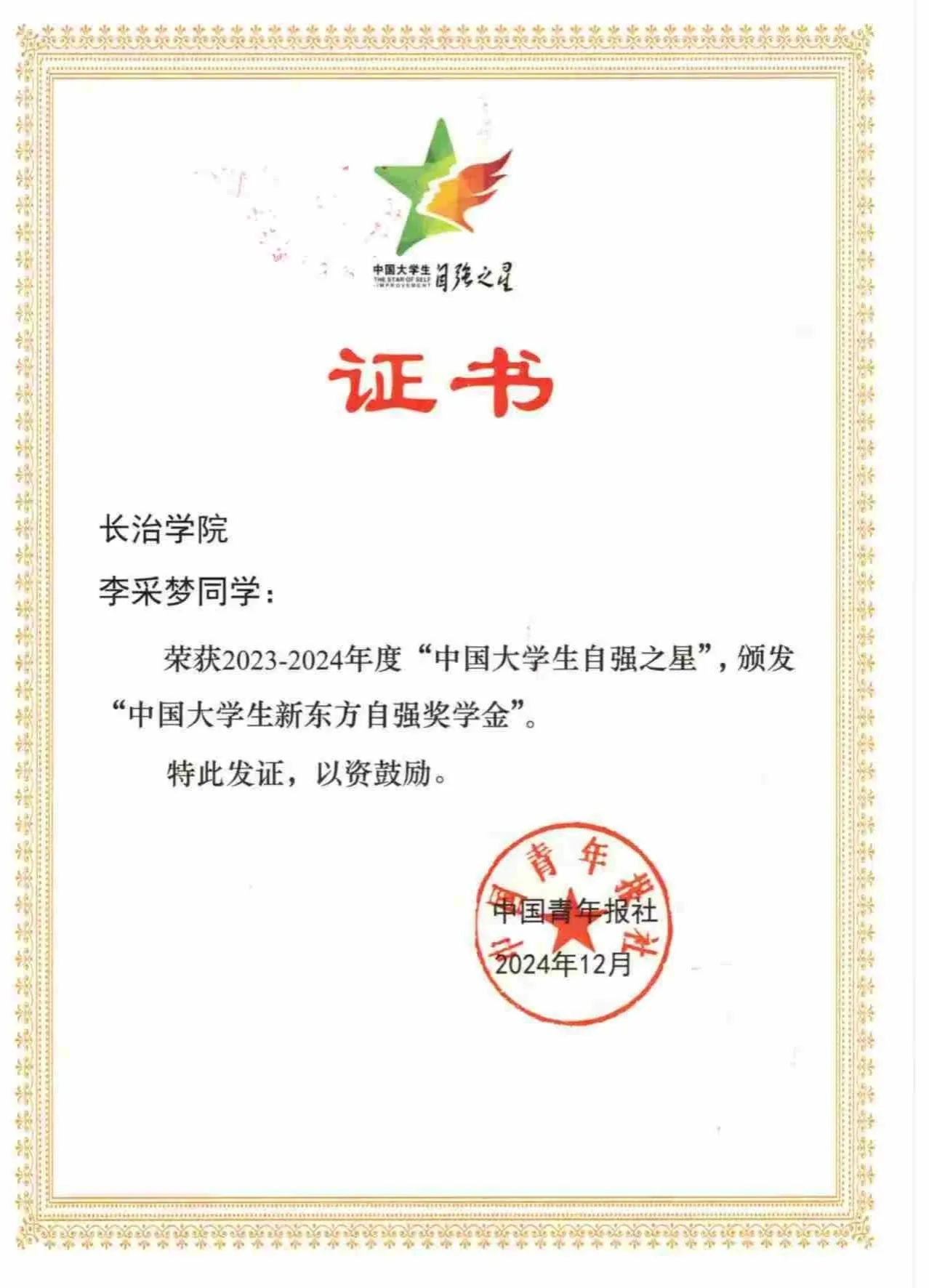 “中国大学生自强之星”奖学金推报活动是由共青团中央、全国学联指导,团中央基层建设部、中国青年报社主办。本年度推报活动以“自信自强 挺膺担当”为主题,在前沿科技攻坚领域,鼓励青年勇攀科技高峰,钻研核心技术,以创新思维为驱动,为我国科技自立自强贡献力量;在乡村振兴的广阔天地中,引导青年发挥知识与智慧优势,面对社会服务需求,倡导青年秉持奉献精神,参与志愿服务、社区建设等公益活动,传递温暖与正能量;在保家卫国的神圣使命中,激励青年坚定投身国防事业,守卫祖国疆土,彰显新时代青年的忠诚与担当。
