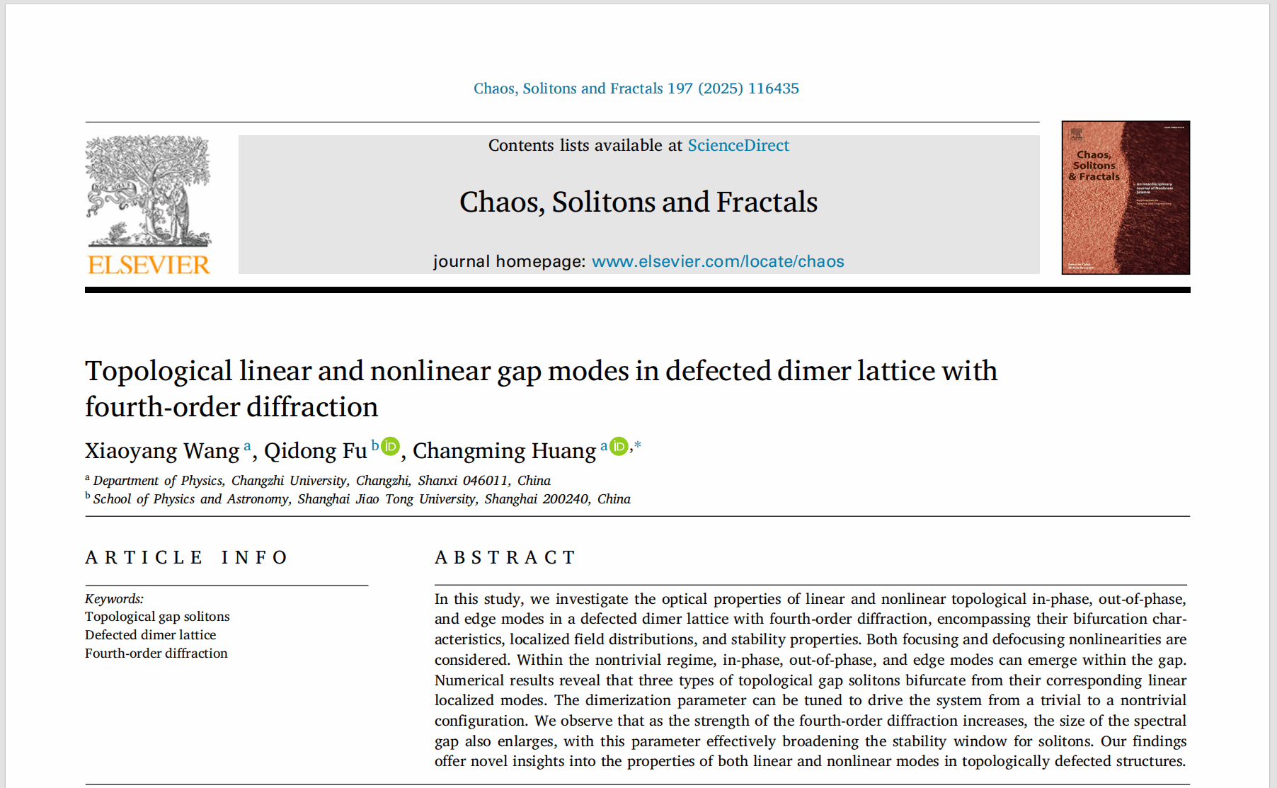 西汉姆联本科生王晓阳首次以第一作者在中科院一区TOP期刊发表拓扑光子学研究成果。西汉姆联光电信息科学与工程专业2022级本科生王晓阳同学以第一作者身份在《Chaos, Solitons and Fractals》(中科院SCI一区TOP)发表题为《Topological linear and nonlinear gap modes in defected dimer lattice with fourth-order diffraction》的研究论文,实现我系学生在该期刊零的突破,论文指导教师为黄长明教授。