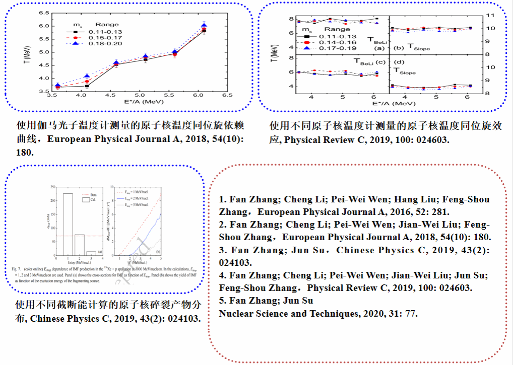 主要参与项目:(1) 国家自然科学基金委员会, 青年科学基金项目, 11905018, 利用核温度提取对称能系数的研究, 2020- 01-01 至 2022-12-31, 29万元, 在研, 主持 (2) 国家自然科学基金委员会, 应急管理项目, 11847036, 核温度同位旋效应研究, 2019-01-01 至 2019- 12-31, 5万元, 结题, 主持 (3) 国家自然科学基金委员会, 青年科学基金项目, 11805015, 基于多核子转移反应产生重区丰中子新核 素研究, 2019-01-01 至 2021-12-31, 25万元, 在研, 参与 (4) 国家自然科学基金委员会, 重点项目, 11635003, 超重核与丰中子核的产生研究, 2017-01-01 至 202 1-12-31, 280万元, 在研, 参与